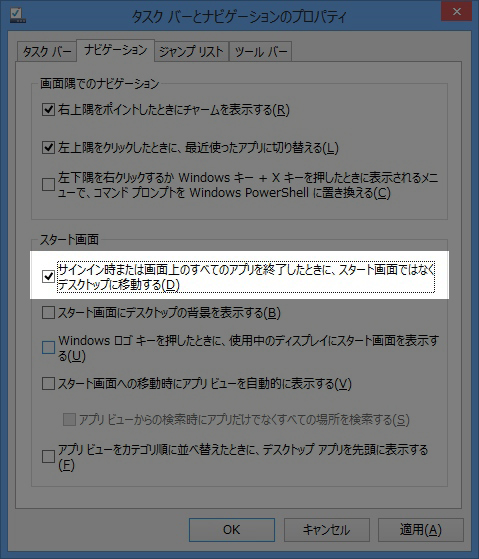 サインイン時に…デスクトップを起動するにチェックを入れれば